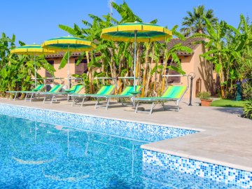 Hoch über dieser Anlage liegen diese Ferienhäuser "Borgo", die Sie mit dem eigenen Wagen oder, zum Beispiel nach einem üppigen Mahl im Restaurant - über einen fünfminütigen Spaziergang den steilen Hügel hinauf erreichen. Hier oben ist es herrlich ruhig und im Sommer weht immer ein laues Lüftchen. Fantastisch! Olivenbäume, Zwergpalmen und Mastixbüsche rahmen dieses entspannte Ambiente ein. Je nach Windrichtung und Sonnenstand stehen Ihnen zwei unterschiedlich ausgerichtete Pools mit Liegen und Sonnenschirmen zur Verfügung, hinter den Wohnungen steht eine große Barbecue- und Grillecke zur Verfügung.