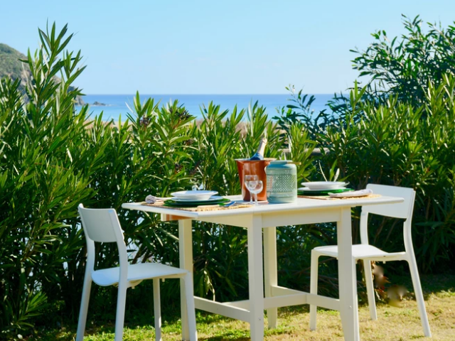 Einfache, lichtdurchflutete Ferienbungalows in einzigartiger Lage über dem Strand von Chia im Süden Sardiniens. Hier genießen Sie eine atemberaubende Aussicht auf die weißen Sandstrände von Chia und die Dünen.