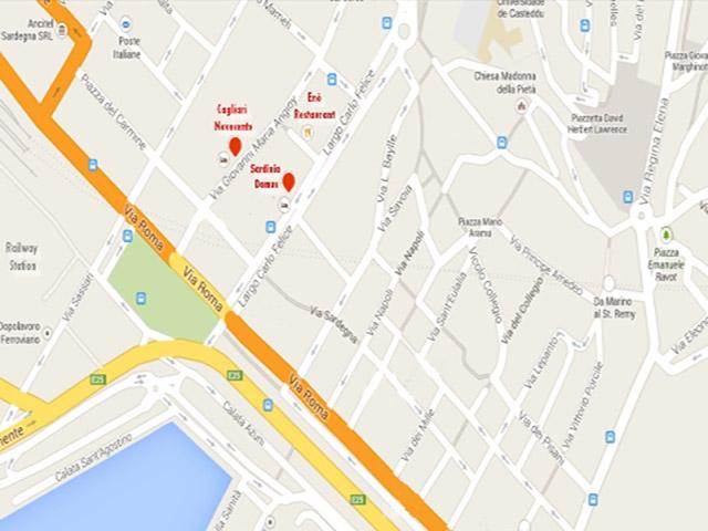 Das Stadtzentrum beginnt an der imposanten Hafenmole an der Via Roma, die in Richtung des Hauptbahnhofs und des Rathauses verläuft, dort, wo sich die Via Roma und die breite Straße, die Largo Carlo Felice, kreuzen. Über die Largo Carlo Felice gelangen Sie auf die etwas höher gelegene Piazza Yenne, eine gemütliche "Piazza" mit kleinen Straßencafés und gleichzeitig der „Eingang“ in die Einkaufsstraße, Via Manno.