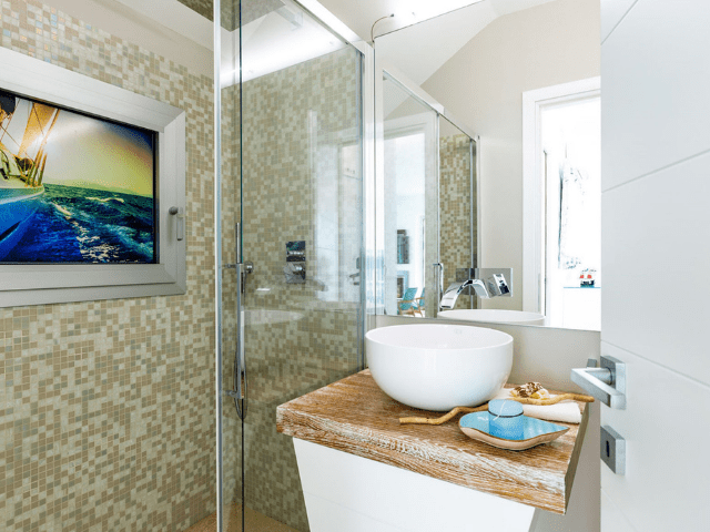 Die Villa wird durch ein Tor betreten, das auf die große Veranda mit mit Waschmaschine, Spüle und Backofen führt. Im Vorgarten können Sie auch bequem Ihr Auto parken. Auf der Veranda befindet sich der Eingang zur Villa. Er führt direkt in den lichtdurchfluteten Wohnbereich, der optisch in Sitz- und Essbereich geteilt ist. Der große offene Bereich wird durch die geräumige und funktionale voll ausgestattete Küche mit direktem Zugang zum Portikus vervollständigt. Auf der gleichen Etage befindet sich der Schlafbereich, bestehend aus einem Doppelzimmer mit wunderschönem Meerblick und eigenem Bad mit Dusche und einem Zweibettzimmer mit Einzelbetten mit einem Bad mit Dusche außerhalb des Zimmers. Der große Portikus ist dem Meer zugewandt und verfügt über einen Ruhebereich mit Esstisch und Sitzecke.