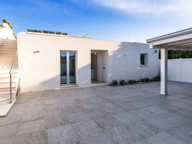 Hochwertige Materialien im eleganten, raffinierten und einfachen Interieur mit klaren, nüchternen Linien, die ein herrliches natürliches Licht genießen. Der geräumige, helle und gemütliche Wohnbereich führt auf die überdachte Terrasse, die zu einem wunderschönen Garten der Sinne führt, der mit seinen herrlichen Kontrasten aus hellen, intensiven Farben, und dem würzigen Duft der Myrte und der Strohblume herrlich mediterrane Akzente setzt.