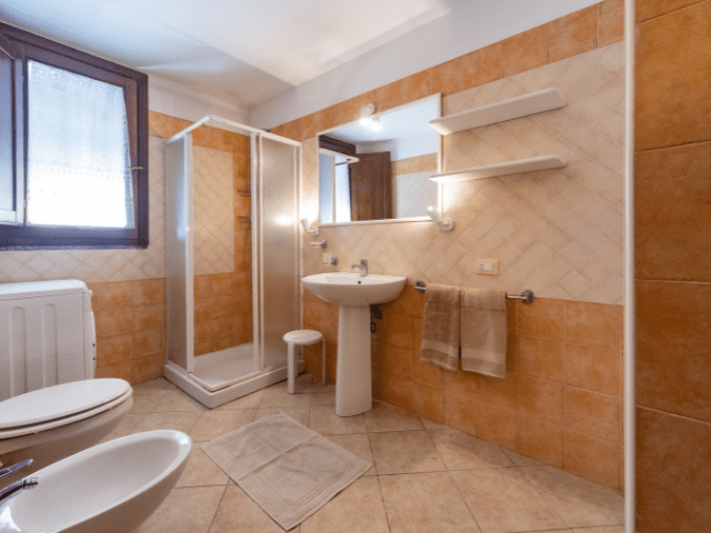 • einem Badezimmer mit Duschkabine und Waschmaschine.