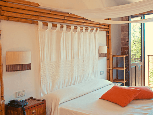 Hier gleicht kein Zimmer dem anderen: Mit Chic und Charme haben die drei Hotelbesitzerinnen in jedem der nur zwölf Gästezimmer Ihre Kreativität walten lassen. Knorrige Wachholderbalken, Baldachine, schwere Holzmöbel oder leichte, bunte Schubladenkästen sorgen für eine individuelle Atmosphäre ohne überladen zu wirken. Sehr großzügig sind die beiden Juniorsuiten und die Deluxe Zimmer mit Terrasse zur Hotelrückseite. Besonders beliebt sind aber die Zimmer mit Zierbalkon, die Zimmer im zweiten Stock bieten sogar seitlichen Meerblick. Vor allem bei Rundreisegästen sind die beiden Standardzimmer ohne Balkon beliebt. Zum Ausspannen und relaxen stehen im Garten Korbmöbel und Liegestühle zur Verfügung.