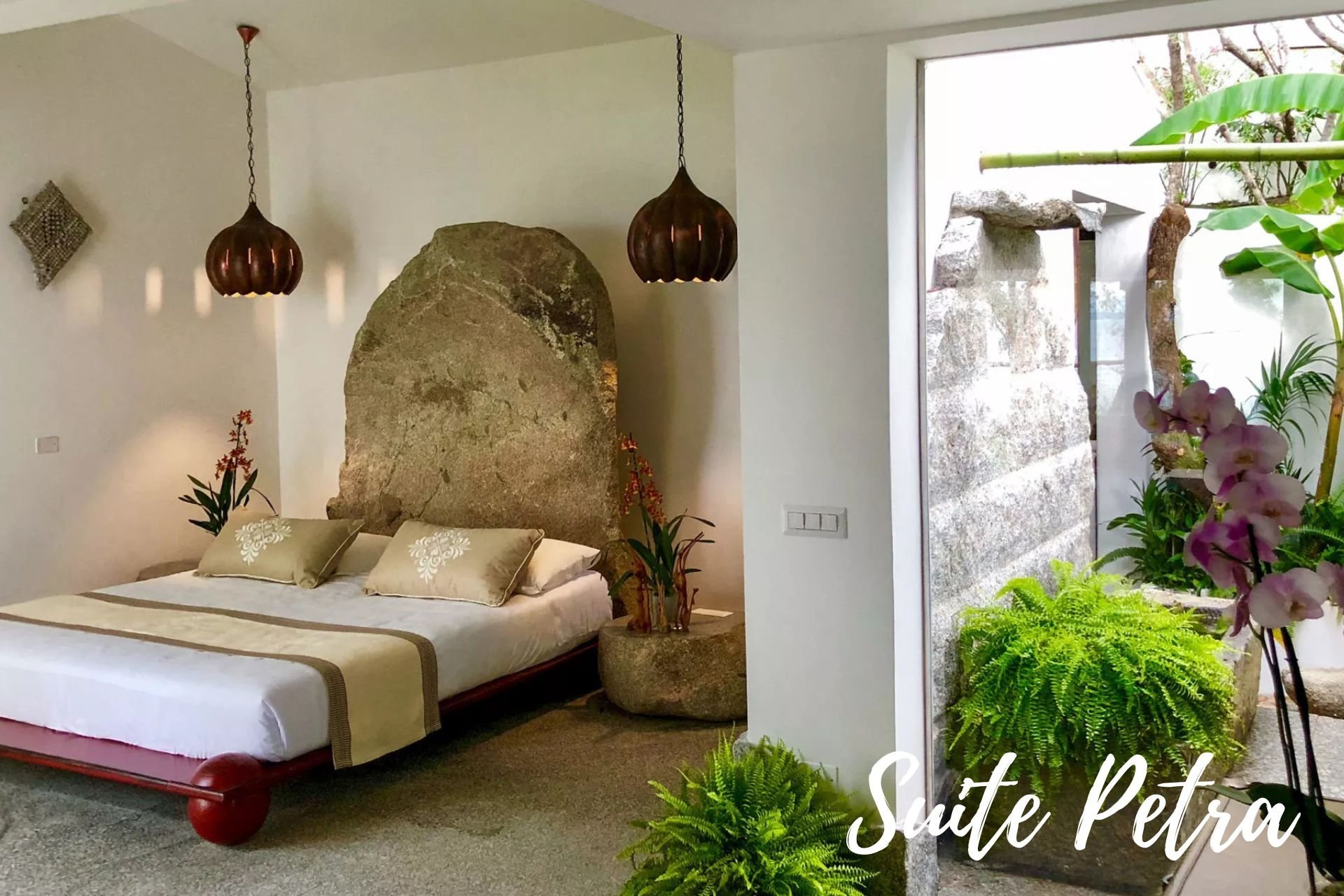 • Petra Suite: Ein großer Garten, gepflegter Rasen, Steinskulpturen, Eleganz und Komfort einer Suite mit Meerblick.