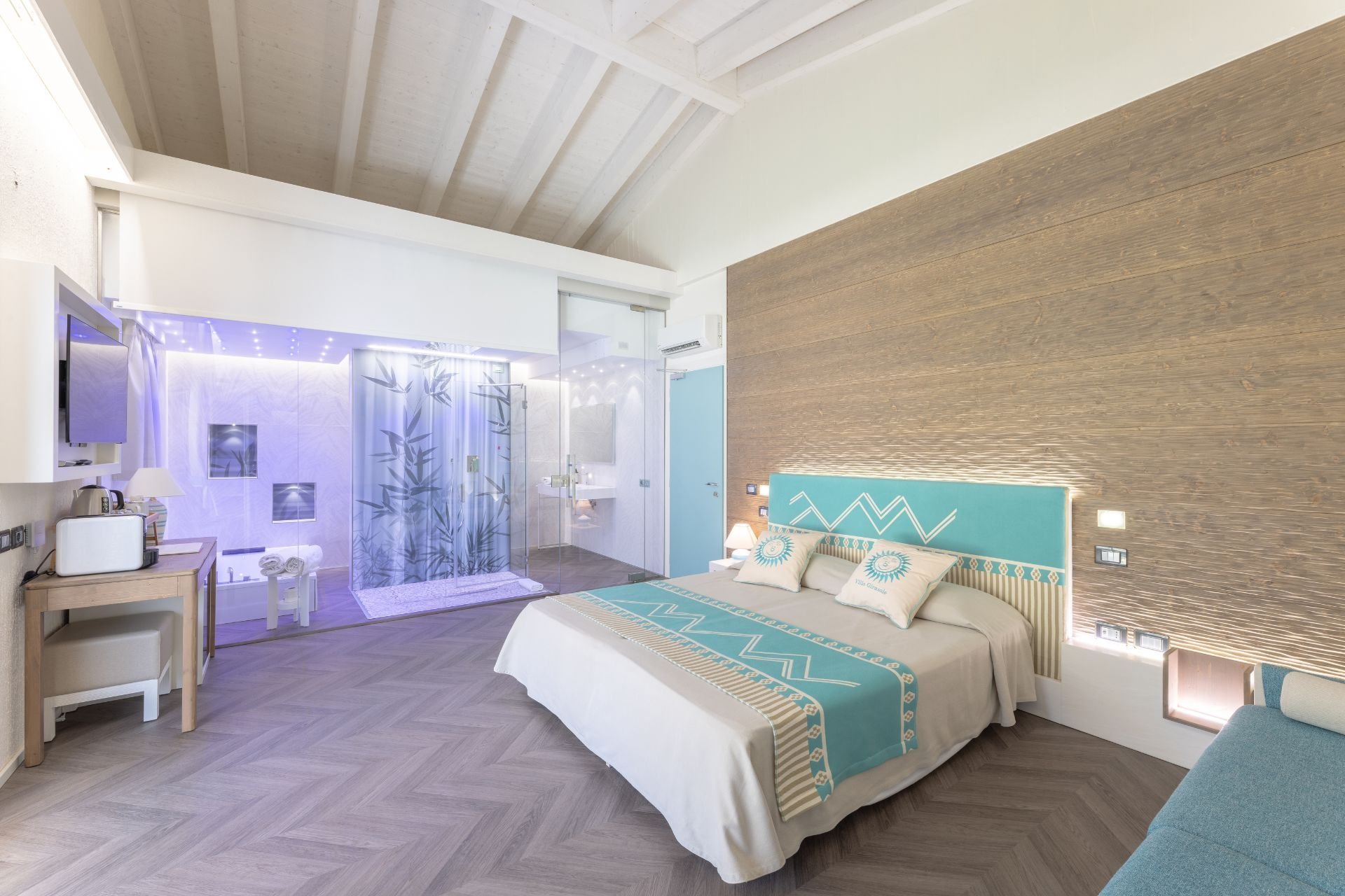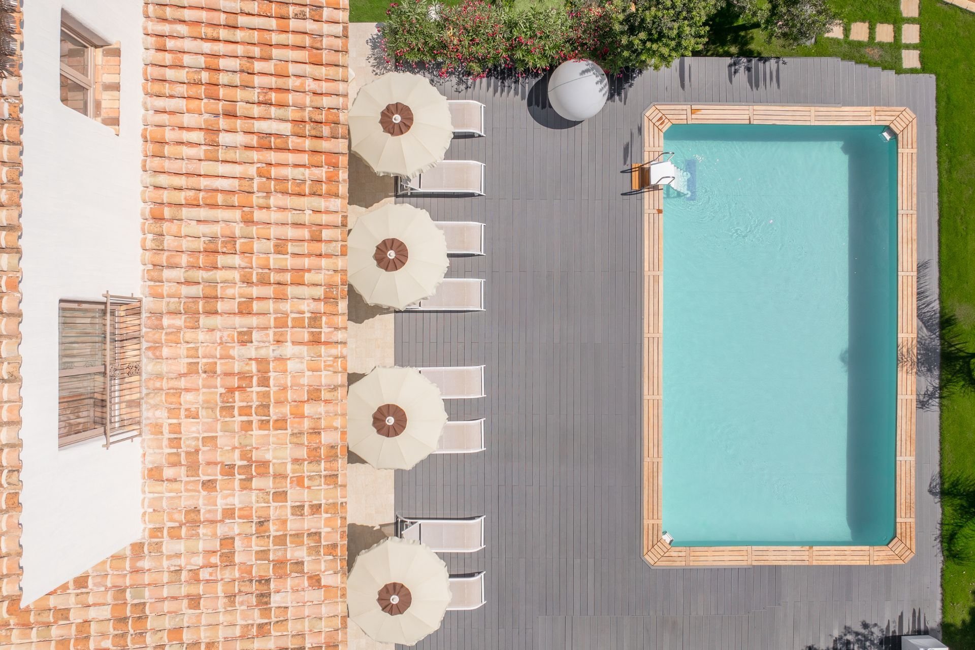 Im Erdgeschoss befindet sich ein elegantes Deluxe-Doppelzimmer mit direktem Zugang zu einer privaten Terrasse, die zum Verweilen im Freien einlädt. Für gehobene Ansprüche steht die Executive-Suite zur Verfügung, ein Vierbettzimmer mit Whirlpool, das Entspannung pur verspricht und ebenfalls über eine Terrasse mit malerischem Gartenblick verfügt. Zusätzlich bieten drei geräumige Superior-Vierbettzimmer Komfort und Privatsphäre, wobei eines im Erdgeschoss mit direktem Pool- und Terrassenzugang und die anderen beiden im ersten Stock liegen, eines davon mit eigener Terrasse. Zur Unterhaltung tragen Flachbildfernseher und ein Dolby-Surround-System in jedem Zimmer bei. Für ein angenehmes Raumklima sorgt die Klimaanlage in allen Räumen, und eine Waschmaschine steht ebenfalls zur Verfügung.