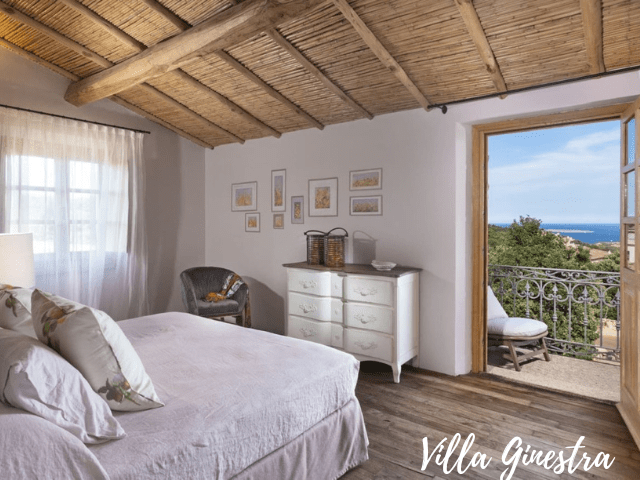Große Villa im sardischen Stil, mit Naturstein verkleidete Wände, auf zwei Ebenen angelegt, drei Badezimmer mit Whirlpool-Badewanne und eine kleine Terrasse im Obergeschoss. Die Villa Ginestra verfügt über zwei 2-Personen-Suiten, ein Wohnzimmer und eine Küche im Erdgeschoss. Auf der ersten Etage befindet sich ein drittes Schlafzimmer mit Terrasse und Meerblick. Wie die anderen Villen gibt es auch einen eigenen beheizten Swimmingpool im Garten.
