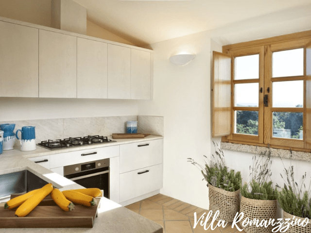 Mit vier Schlafzimmern ist das 8-Personen-Anwesen mit dem schönen Namen Romazzino die größte Ferienvilla in der Anlage. Die Zimmer haben alle einen eigenen Eingang und das Wohnzimmer ist gemütlich in Blautönen eingerichtet. Draußen können Sie auf der überdachten Veranda entspannen, während sich die Kinder im Garten oder am Pool vergnügen. Der Anbau befindet sich eine Etage tiefer. Hier befindet sich ein weiteres Schlafzimmer, wenn Sie mit 9 oder 10 Personen reisen.